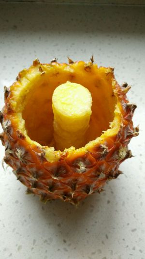 菠萝对半切开,用水果刀把里面的果肉挖空,菠萝肉备用