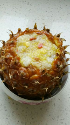 糯米泡一晚上,装碗上锅蒸六七成熟, 伴入葡萄干,枸杞,玉米粒,菠萝块 放入菠萝壳内,继续蒸20分钟即可