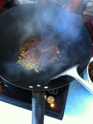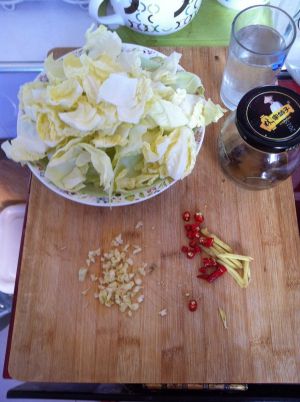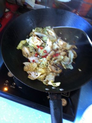 将锅里倒油,然后扔作料,迅速放捞起的包菜。均匀翻炒。