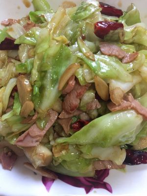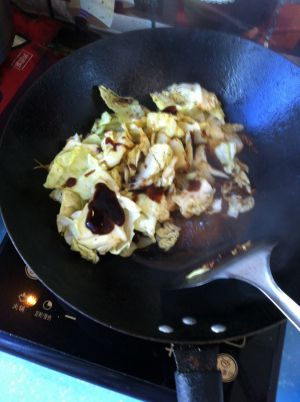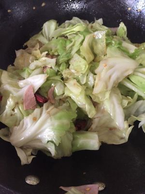 炒到培根看起来颜色不那么淡,就可以放入包菜了(培根很好炒,如果用的是开袋即食的火腿,时间就更短些)。加入适量蒸鱼豉油,和少量盐(蒸鱼豉油里本来就有咸味,所以少加盐)。出锅时倒一点点花椒油。