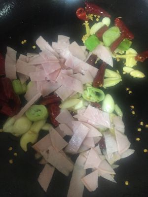 热锅凉油先把蒜、生姜和少许葱放进去煸炒,然后加入干辣椒,因为油温太热的话干辣椒容易糊,所以晚一点放。炒出香味后倒入切好的培根一起炒。