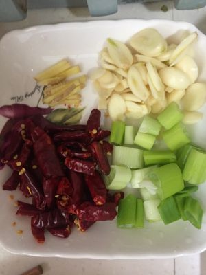 干辣椒掰成两半,蒜切片,生姜切丝,葱切段。