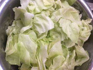 将包菜撕成小块,用盐水泡5分钟后捞起。