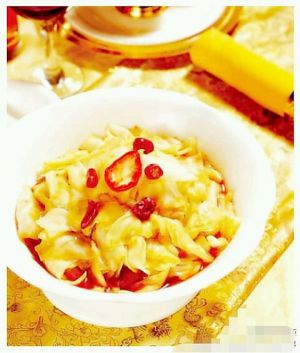 锅中入油油热加入蒜瓣辣椒碎,炒香倒入包菜,翻炒几下加入盐和十三香,翻炒均匀,锅干的沿锅边加些清水,待包菜变软沿锅边淋入少许生抽和多一点的醋,加入一丢丢白糖,翻炒均匀出锅即可。