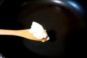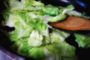 炒锅烧热,放入猪油融化后,放入备用的圆白菜翻炒。只需要翻炒一小会儿,等圆白菜稍微软了,就立刻捞出。