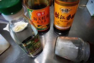 接着放入圆白菜,加入备用的调味料。这里用的醋,以老陈醋最好,量少还味香。