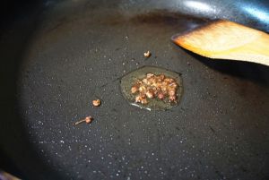 煸炒出香味的时候,把花椒捞出,接着放入干辣椒和蒜瓣翻炒。