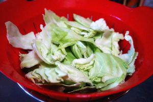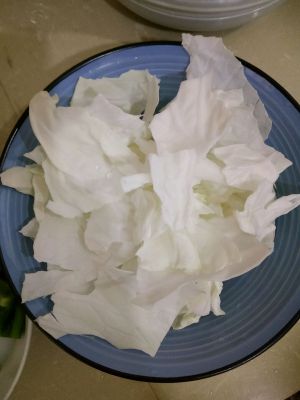 包菜去掉外边一层, 切掉根部,掰开, 揪成一片一片的, 洗净控干水分。
