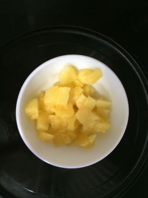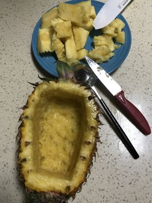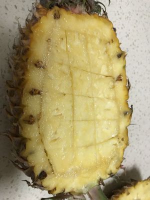 菠萝挖出果肉,不要乱挖。因为果肉切丁