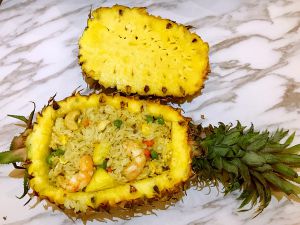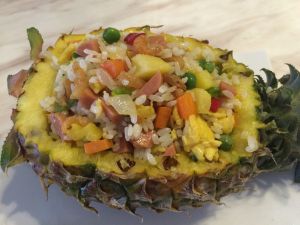 糯米饭蒸好后放入适量的白砂糖和菠萝肉,果汁,枸杞,葡萄干拌匀后盛进挖空的菠萝中上火再蒸十五分钟