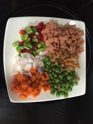 胡萝卜丁、豌豆、洋葱丁甜红椒青椒切丁。火腿切丁,虾仁