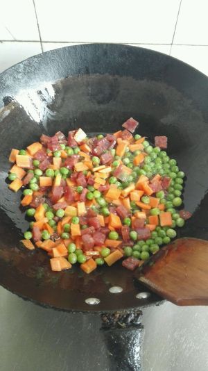 菠萝放盐水里泡泡~切丁。胡萝卜,甜香肠,切丁。豌豆入水~捞起。白米饭,我用的热的,好炒!