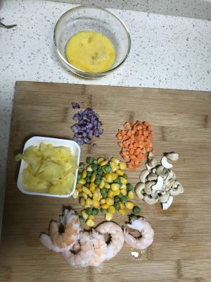 准备好所有食材,胡萝卜切小丁,洋葱切碎,玉米豌豆焯水,鸡蛋打散,大虾煮熟菠萝切丁