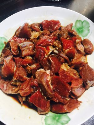 羊肉切丝,加料酒、孜然,盐,淀粉腌制入味。