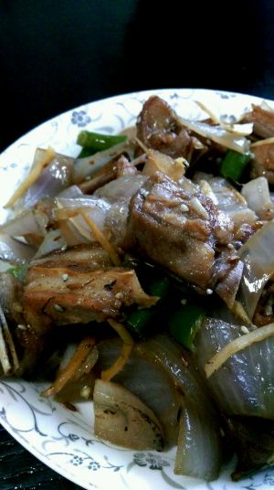 同时,洗一口干净的锅开火放油。放入生姜片,再放入洋葱片,还有辣椒一起炒。炒到洋葱片变软的时候,把烤箱里烤好的羊排拿出放在锅里一起炒。加点盐调味,材料等混合好后,就可以出锅了。