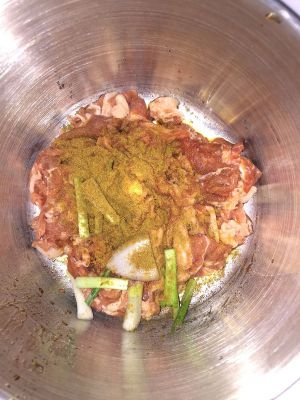 将羊肉切丁,用所有调料拌匀,腌渍20分钟。