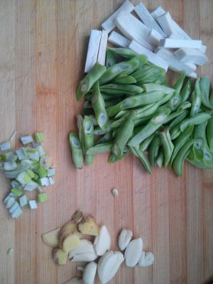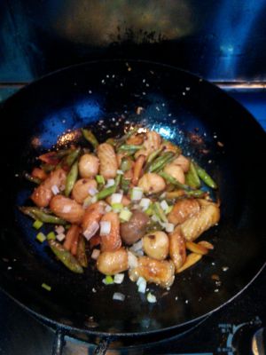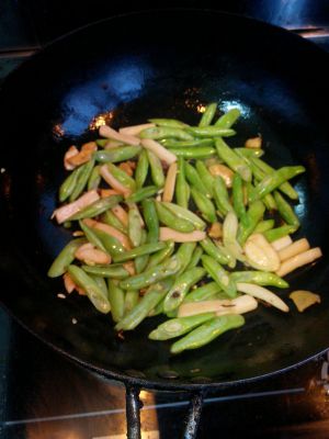 热锅凉油煸香花椒、辣椒、姜蒜,放四季豆跟杏鲍菇;