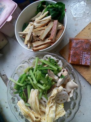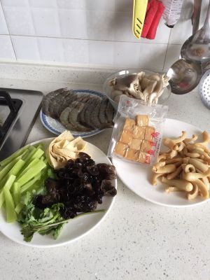 来吧,展示: 1.首先你喜欢的食材请备好,内容形状你说了算 2.锅内热足够的油,把菜挨个过油混熟它们