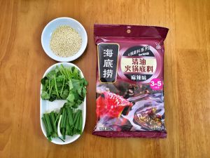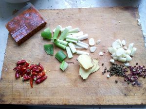 炝锅食材合影~凉锅凉油先放花椒麻椒慢慢呛,接着放干辣椒段,然后放葱姜蒜(如果你食材多,油一定要倒够) 待香味出来以后放火锅底料炒散,炒出红油,再加一勺郫县豆瓣酱。