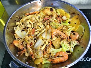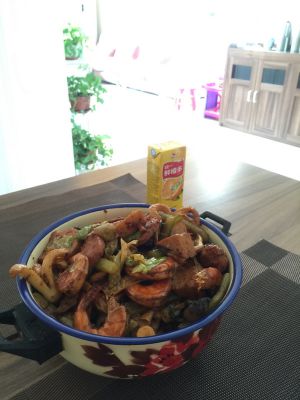 热锅倒入底料,先翻炒肉类和虾(因为肉类和虾比较难入味)