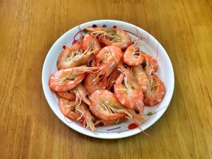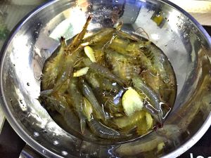 烧一锅水,倒适量的料酒,切4片姜片,将虾倒入