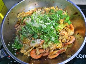 翻炒完所有料之后加入葱段、香菜和芝麻,继续翻炒(蔬菜会出水分,不用担心粘锅)