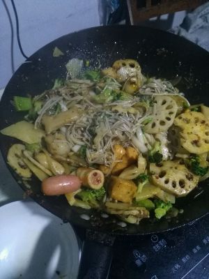 最后依次将慢熟的菜先放,最后放熟的快的菜,炒至所有菜上伴有底料,盛盘