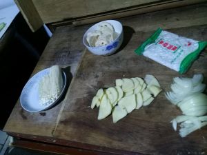 先把土豆、莲藕切片,金针菇去根洗干净,洋葱切丝备用。