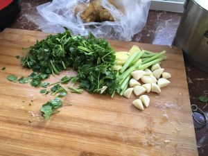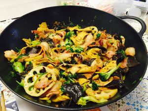 炒菜,放油煸炒大蒜,放入调料,在放肉,接着放各种菜