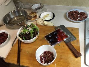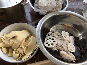 准备食材虾,蟹棒,莴笋,金针菇,莲藕改刀