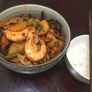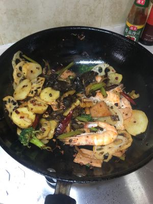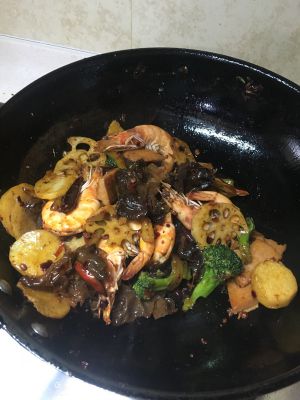 四五分钟后放入香菇木耳,大虾,继续翻炒,加入少许五香粉,没有就加花椒也行,少许酱油上色增香,翻炒均匀