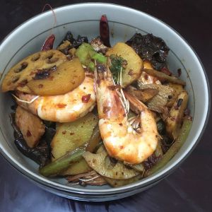 依次放入虾,蔬菜,调味最后放麻辣花生翻炒。