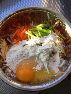 把煮好的土豆拍成泥,加入萝卜,玉米,白菜