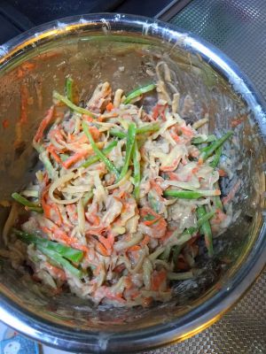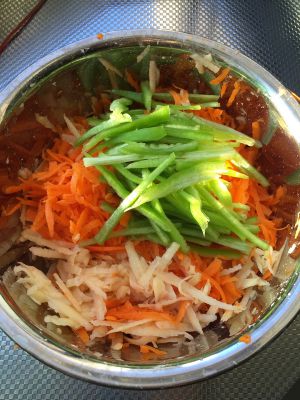 将土豆、胡萝卜擦丝,尖椒切细条丝放在一起备用。