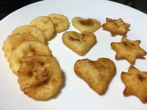 把和好的土豆和淀粉擀平,薄厚适中,用圆形模具扣出,再用筷子和小勺搞出眼睛和嘴巴