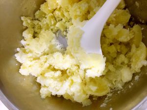 蒸好后,放入碗中趁热压成泥,放入生粉,盐,黑胡椒粉