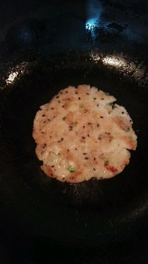 平底锅中倒入适量油,油热后倒入搅拌好的面粉土豆混合物开始煎,一面熟后翻致另一面
