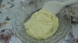 蒸熟的土豆压成土豆泥,尽可能压到无颗粒。