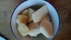 把莲藕和土豆都洗净切成约5毫米的片,然后放入水中备用。
