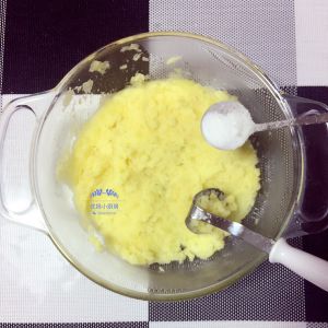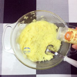 加入适量盐,胡椒粉,淀粉(淀粉为了吸干土豆表面水分)拌匀。用剪刀剪几刀