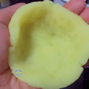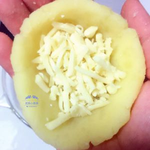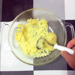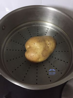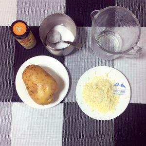 准备食材:土豆一个,干酪碎适量,清水适量,盐少许,洋葱粉适量。在这里需要说明的是,我个人认为美食没有什么固定模式,只要自己喜欢,只要搭配合理科学,你也可以加上任意自己喜欢的食材,比如胡萝卜、葱末、蘑菇、木耳碎都可以。