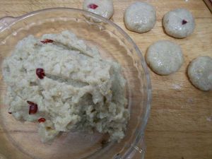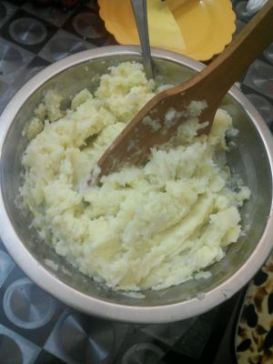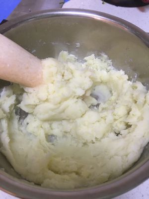 土豆煮熟去皮,加入生粉,黄油20g,压成土豆泥,搅拌均匀