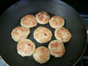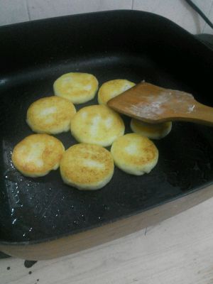 平底锅热锅,压扁的土豆饼坯入锅煎, 用沾了食用油的小勺子压平表面,再翻个身煎,重复多次直到煎至表面金黄。