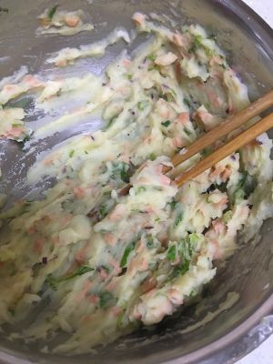 配菜加入土豆泥,放淀粉,盐,五香粉或黑胡椒粉,搅匀