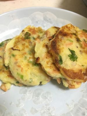 出锅,用厨房用纸吸收一下土豆饼的油份即可装盘,有小孩子也可以分割后再装盘。