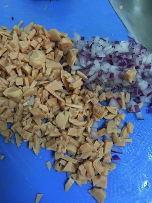 蒸的过程中切配菜,我放的洋葱丁,火腿肠丁和香菜末 注意颜色和味道的搭配