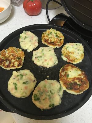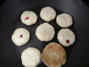 手蘸水捏土豆泥饼,放入已预热抹油的饼铛 小火煎