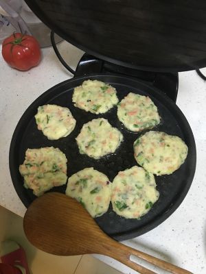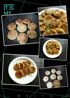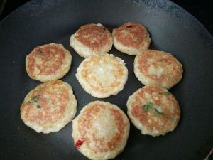 土豆蒸熟去皮后,切碎剁成泥,少许小麦淀粉,再倒入黑胡椒粉,椒盐粉,切碎干红辣椒,拌入土豆泥中,抓拌匀后(用手套),取一小块揉成小圆团,表面沾食用油再压扁,依次完成所有,揉小圆团时可以按自己口味喜欢加入其他,比如葱花,芝士,炒香的培根,或者玉米萝卜丁。