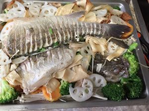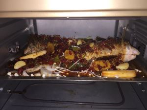 准备工作把鱼打花刀 用纸把水分弄干 下锅煎一下 不用过面粉 直接煎 然后把你喜欢的所有硬的蔬菜焯一下 烤的时候不容易干 保证口感 同时 水不要倒掉 那么开始吧 把调料放进锅中 炒出香味