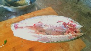 鱼去鳞,取鳃,从鱼头到后背剪开。洗净后洒盐,姜末,料酒码味。
